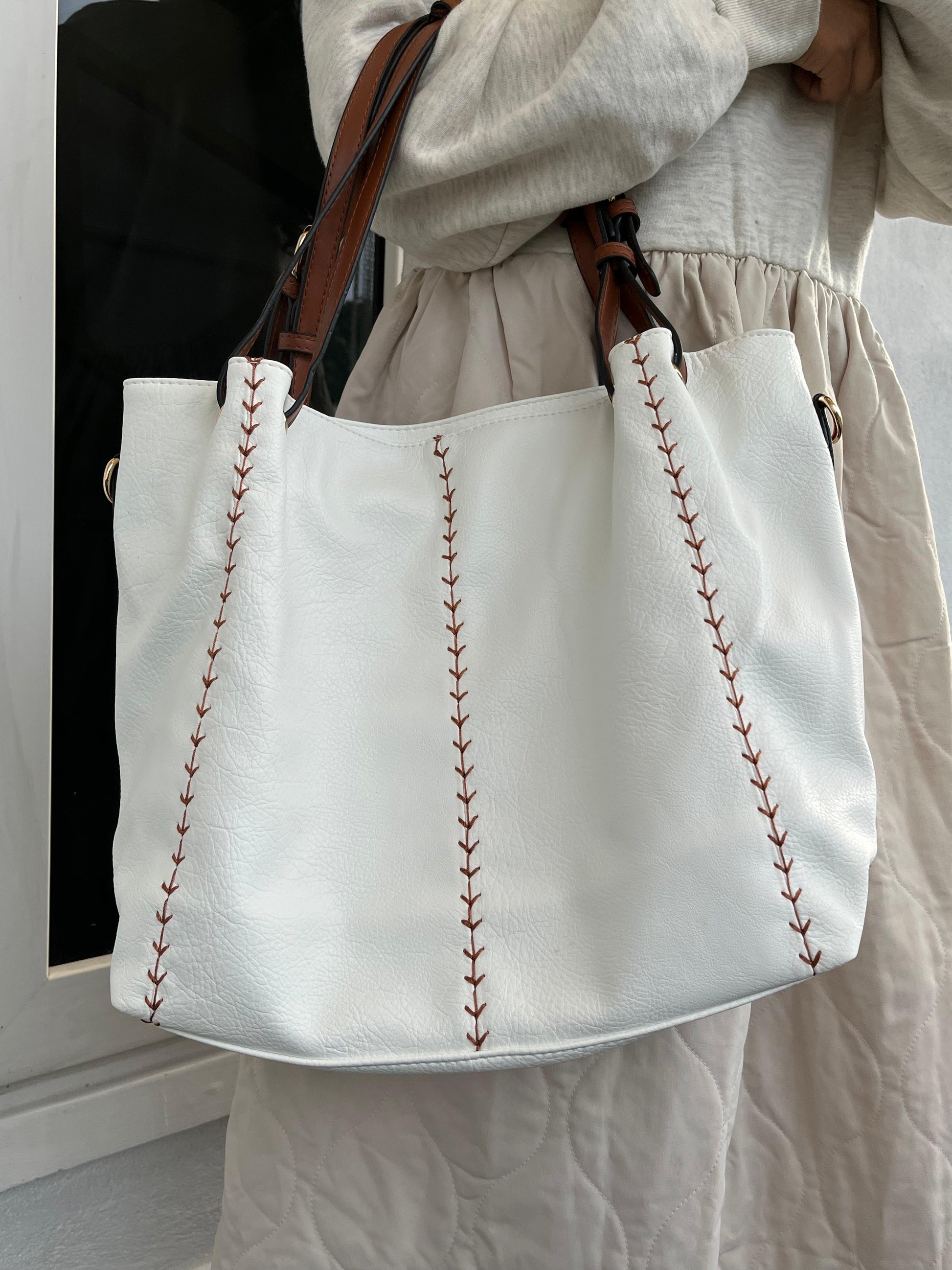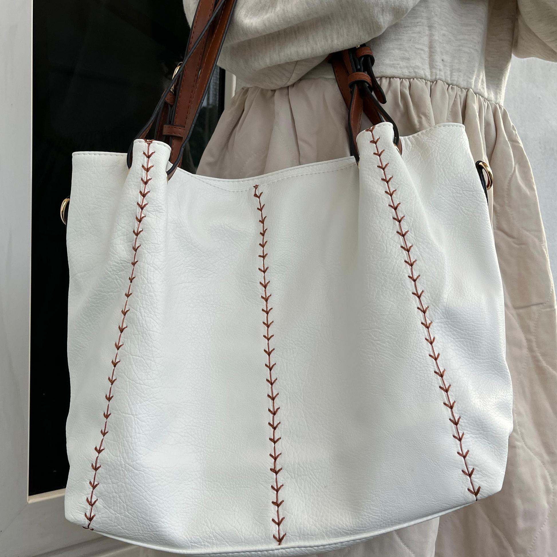 Add elegance to your everyday look with this large white tote bag for women, crafted from high-quality faux leather for durability and style. Featuring contrast brown adjustable shoulder straps and hand-stitched detailing on the front, this handbag is both fashionable and functional.